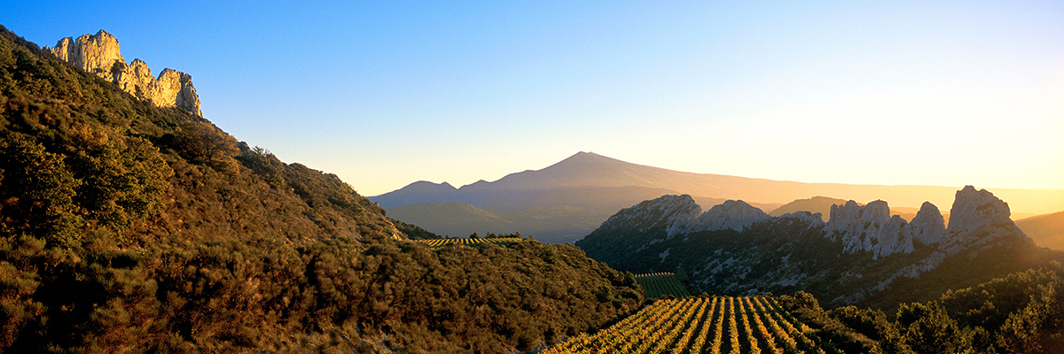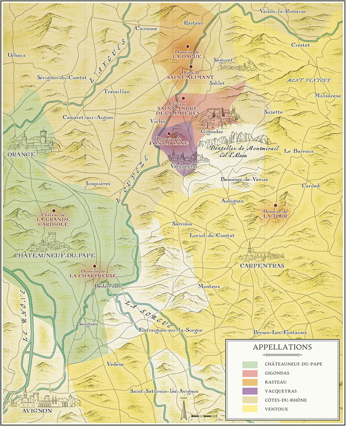 les crus prestigieux des Côtes-du-Rhône méridionales : Châteauneuf-du-Pape, Gigondas, Vacqueyras, Rasteau, Côtes-du-Rhône et Ventoux.