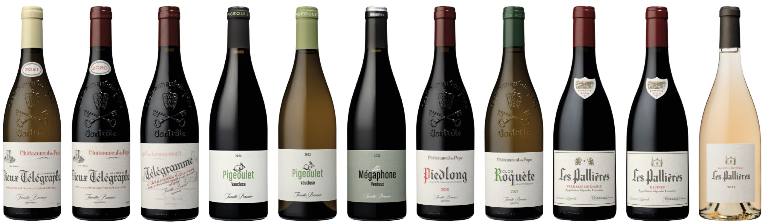 Le domaine du Vieux Télégraphe est exploité par la famille Brunier depuis six générations, exactement depuis 1891. Le vignoble, d’une moyenne d’âge de 60 ans, est situé sur le célèbre plateau de La Crau, haut lieu de la viticulture de Châteauneuf-du-Pape. Ce terroir marque leurs vins d’une minéralité toute particulière, comme s’ils avaient étés filtrés au travers de l’épaisse couche de galets roulés, laissée sur place à la fonte des glaciers alpins, bien avant la formation de la Vallée du Rhône. Domaine du Vieux Télégraphe (en rouge et en blanc), Télégramme (rouge), Piedlong (rouge), Clos Roquète (blanc)… ils cultivent et vinifient différentes expressions du terroir de Châteauneuf-du-Pape, mais aussi Les Pallières à Gigondas (rosé et rouge), Le Pigeoulet et Mégaphone (en rouges) sur les contreforts du Mont Ventoux. Ils sont fous du grenache, cépage qui a trouvé dans nos contrées provençales une terre d’élection.